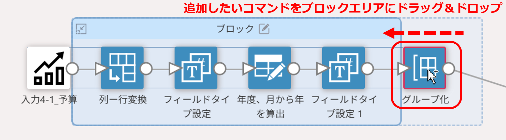ブロックに別のコマンドを追加するには、追加したいコマンドをブロックエリアにドラッグ&ドロップします。