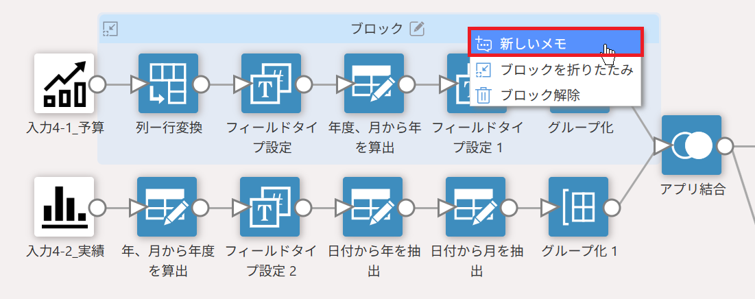ブロックバー、またはブロックアイコン上で右クリックし、表示されるコンテキストメニューから「新しいメモ」を選択することで、ブロックに関連付けたメモを追加できます。