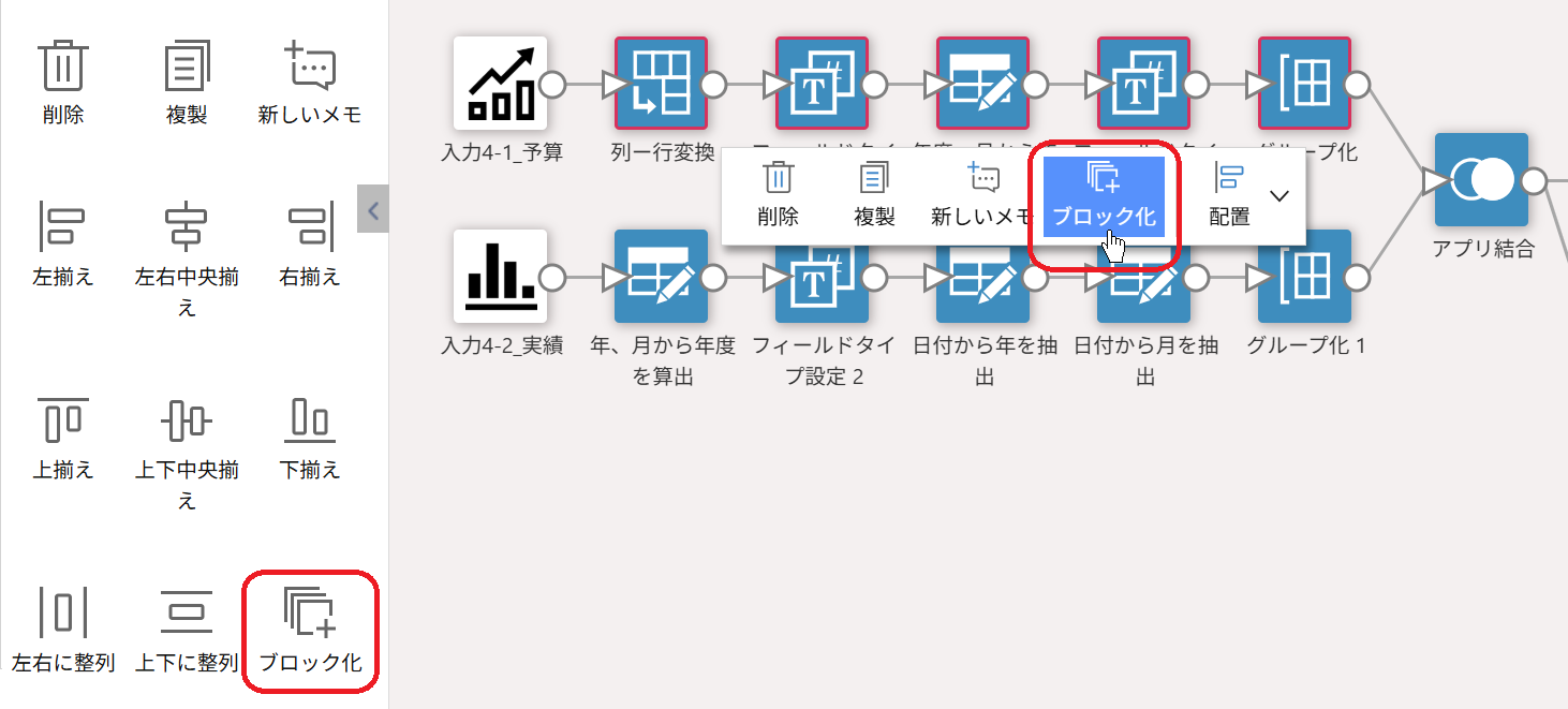 コマンドをブロック化するには、ブロック化したいコマンドを選択した後にフローティングメニュー、または画面左のコマンドパネルで「ブロック化」をクリックします。