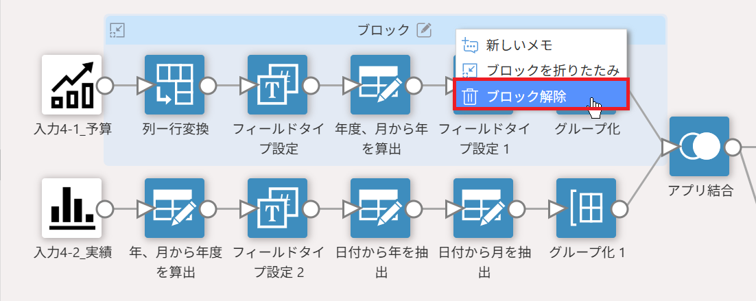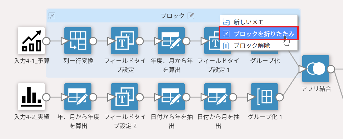 ブロックのバー、またはブロックアイコンを右クリックして表示されるコンテキストメニューからも展開/折りたたみ表示を切り替えることができます。