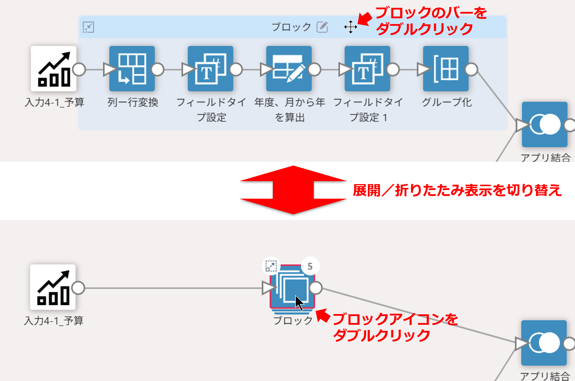 ブロック化されたコマンドは、ブロックのバー、またはブロックアイコンをダブルクリックすることで展開や折りたたみの表示を切り替えることができます。