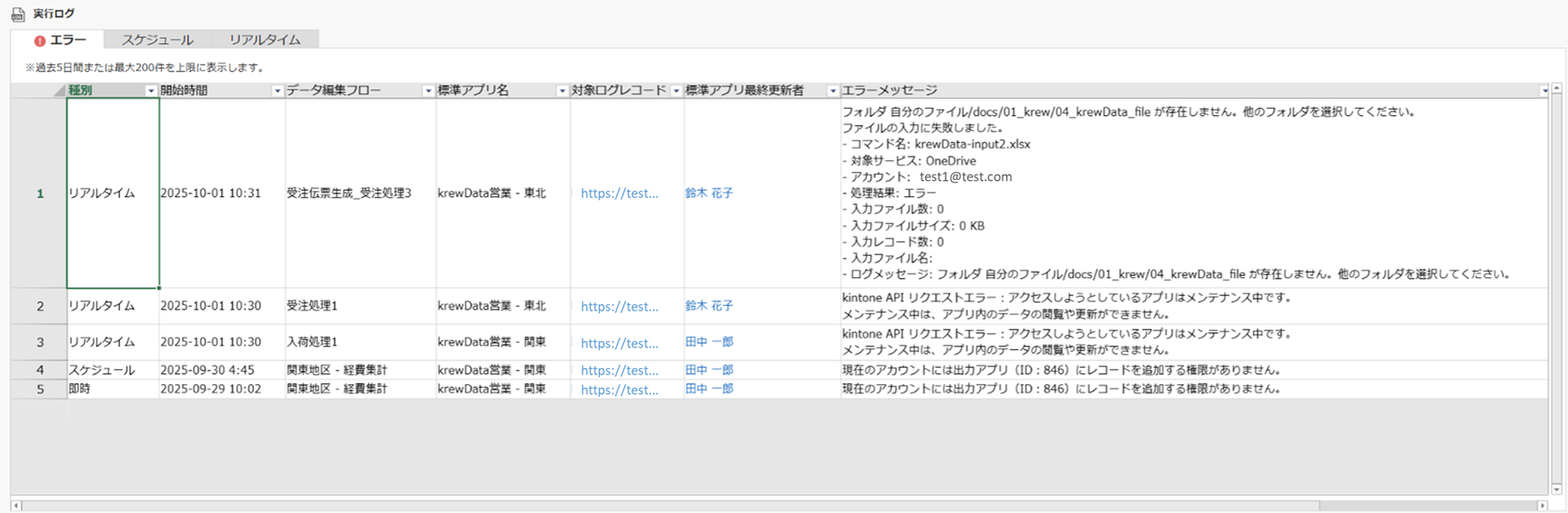 過去5日間で発生したエラーのみを表示します。問題が発生しているデータ編集フローを素早く特定し、その最終更新者を確認したり、詳細ログに遷移したりすることができます。