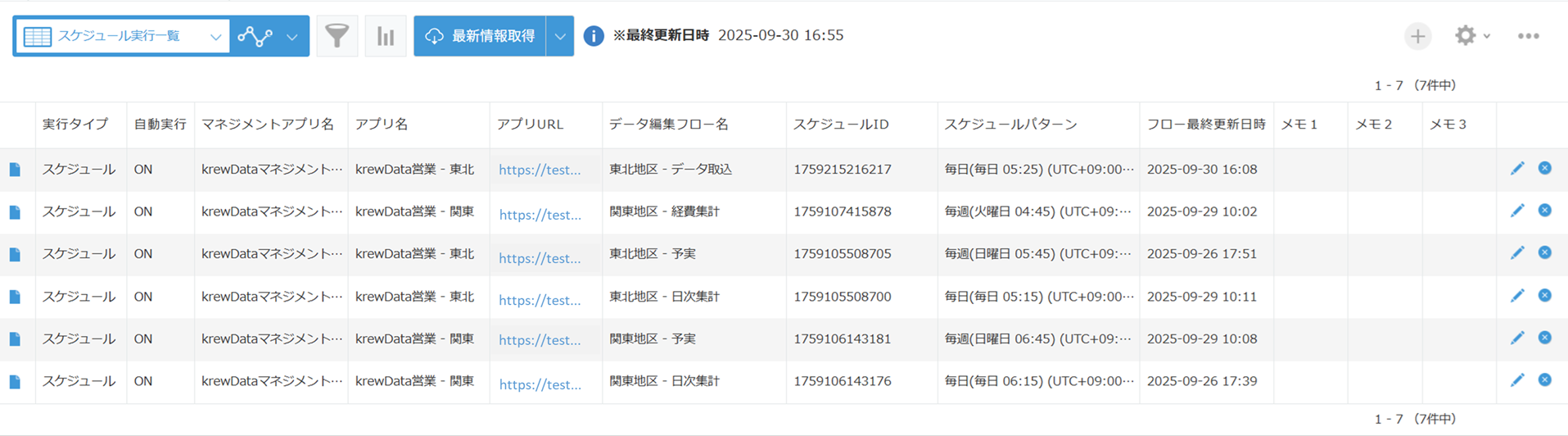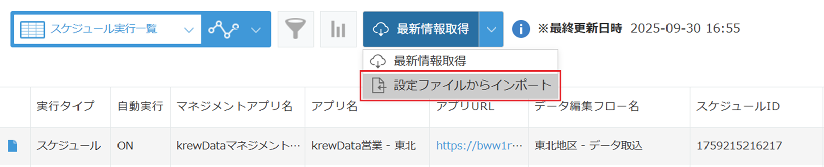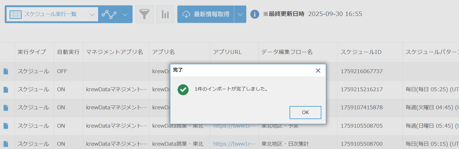 管理対象のkrewData標準アプリで定義されているスケジュール実行のデータ編集フローを一覧で表示します。なお、一覧に表示する項目は自由に変更いただけます。
