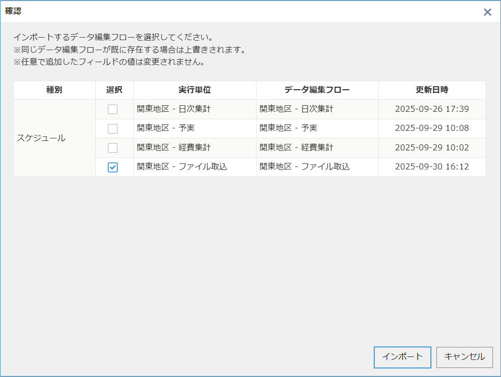 「設定ファイルからインポート」では、krewDataの設定ファイル(JSON)を読み込んでデータ編集フローの情報を一覧に追加できます。この機能は、即時実行で使用しているフローなど、krewDataサーバーに登録されていないフローも管理したい場合に便利です。