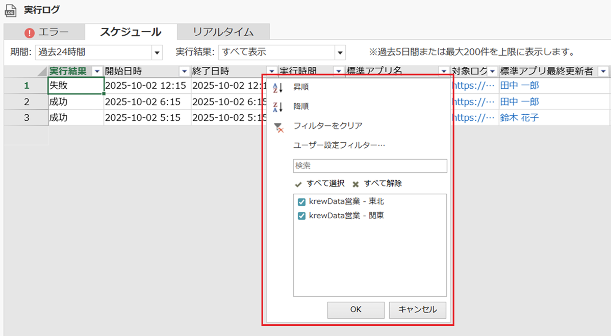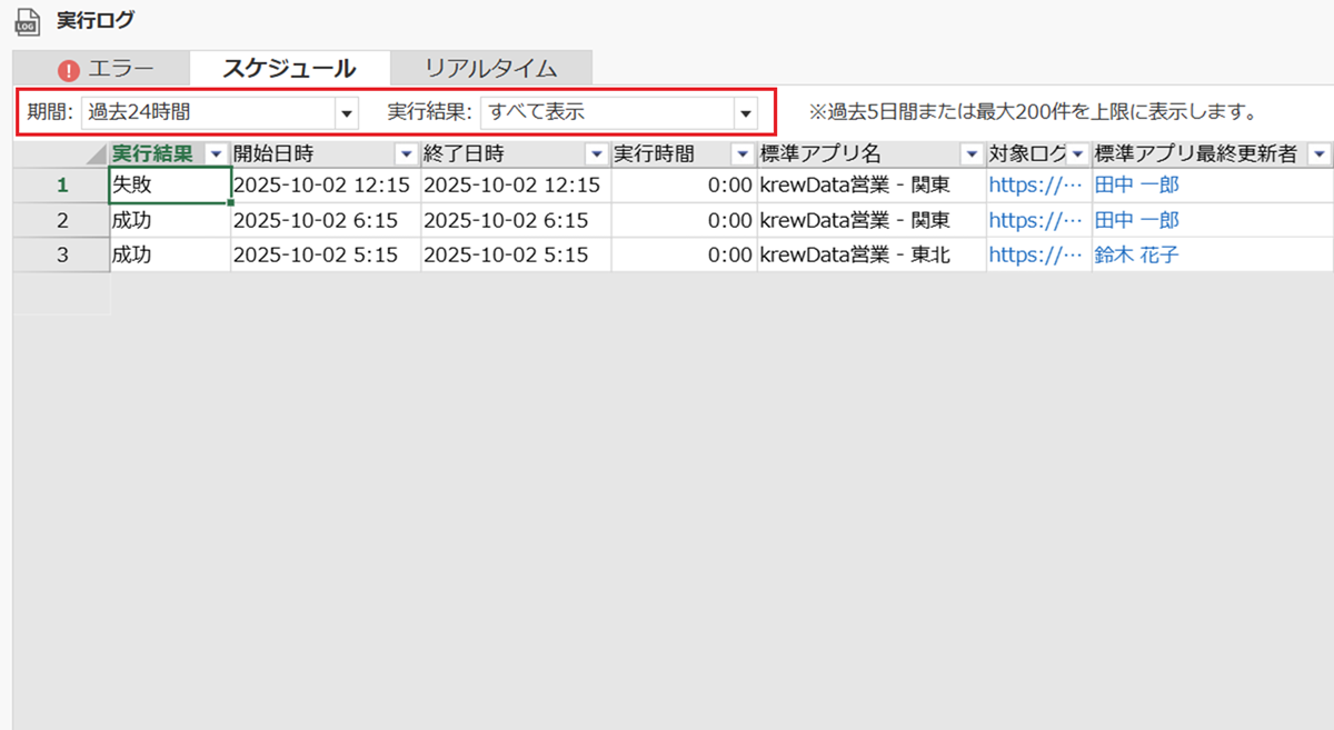 スケジュールタブとリアルタイムタブで使用可能です。画面上部のドロップダウンから期間(過去24時間、過去3日間など)や実行結果(成功のみ、失敗のみなど)をワンクリックで絞り込むことができます。日次の定期確認やエラーチェックに活用できます。