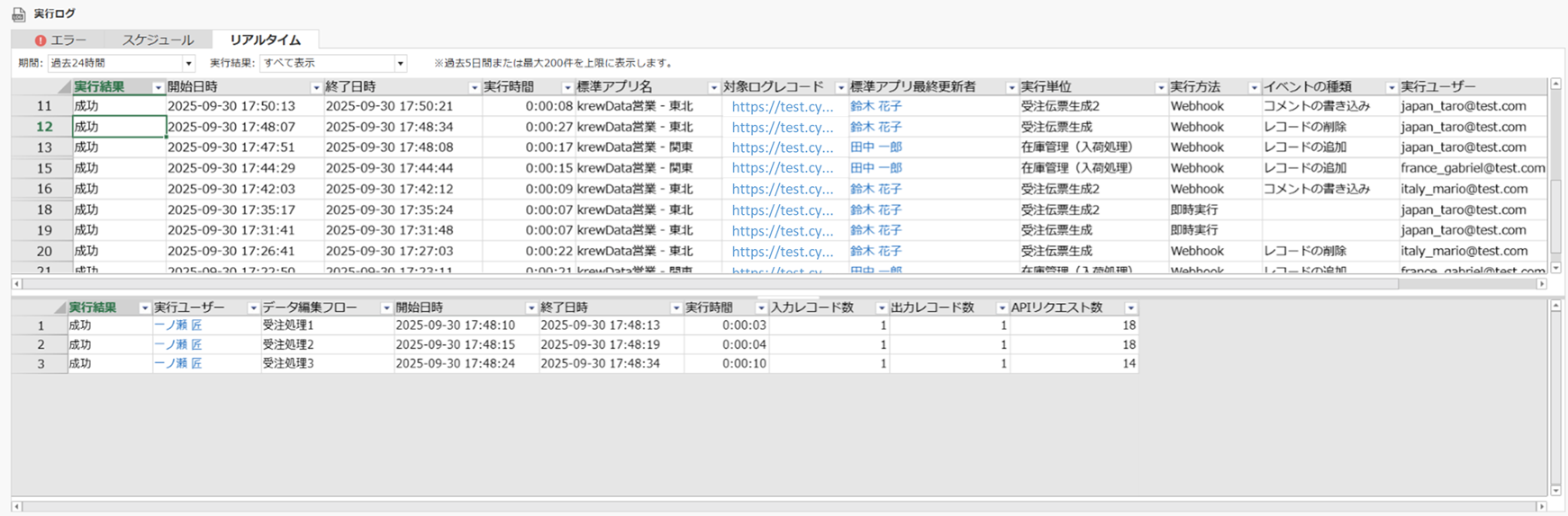 リアルタイム実行のログを表示します。上段が実行単位、下段が実行単位に紐づく各フローの一覧です。実行単位を選択すると、それに紐づくフローが下段に表示されます。