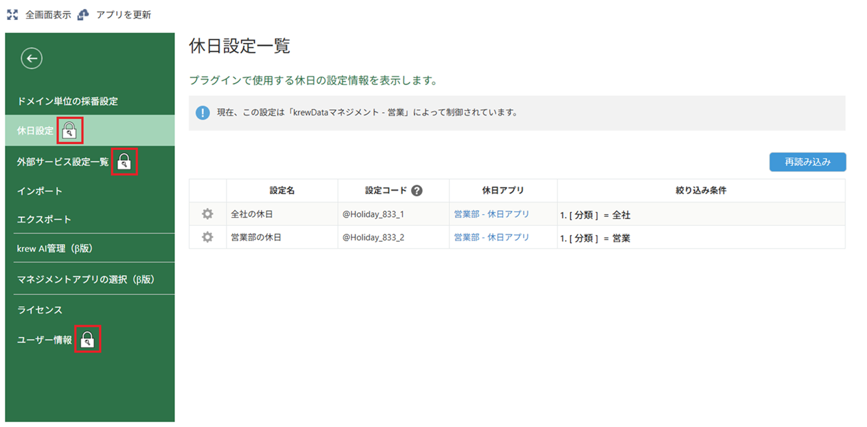 krewDataマネジメントアプリの管理下に入ると、以下の設定項目に鍵アイコンが表示される場合があります。これは、その設定がkrewDataマネジメントアプリ側で管理されていることを示します。これらの設定は、krewData標準アプリ側では読み取り専用となり、変更はできません。