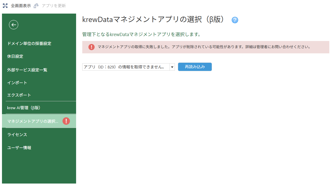 krewDataマネジメントアプリが削除されると、以下のエラーメッセージが表示されます。