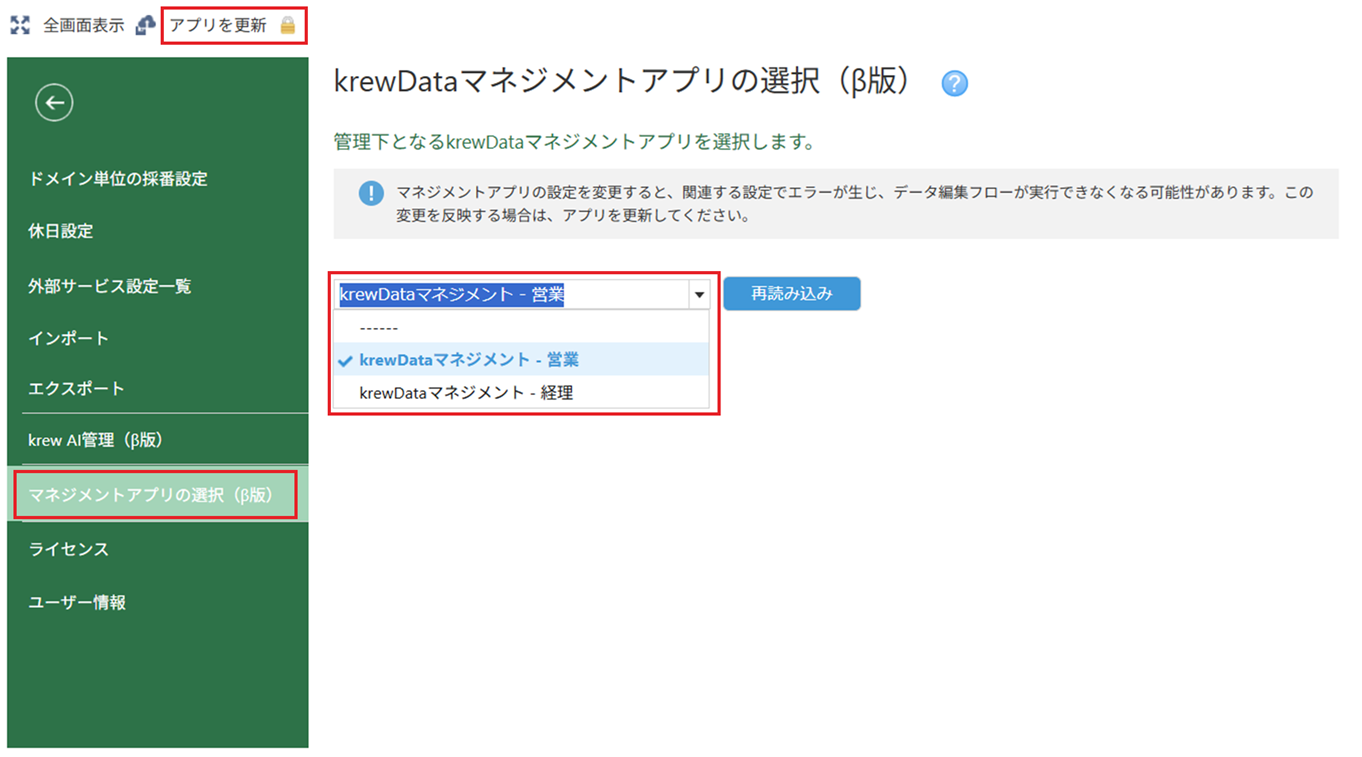 | krewDataマネジメントについて > krewData標準アプリの設定 |