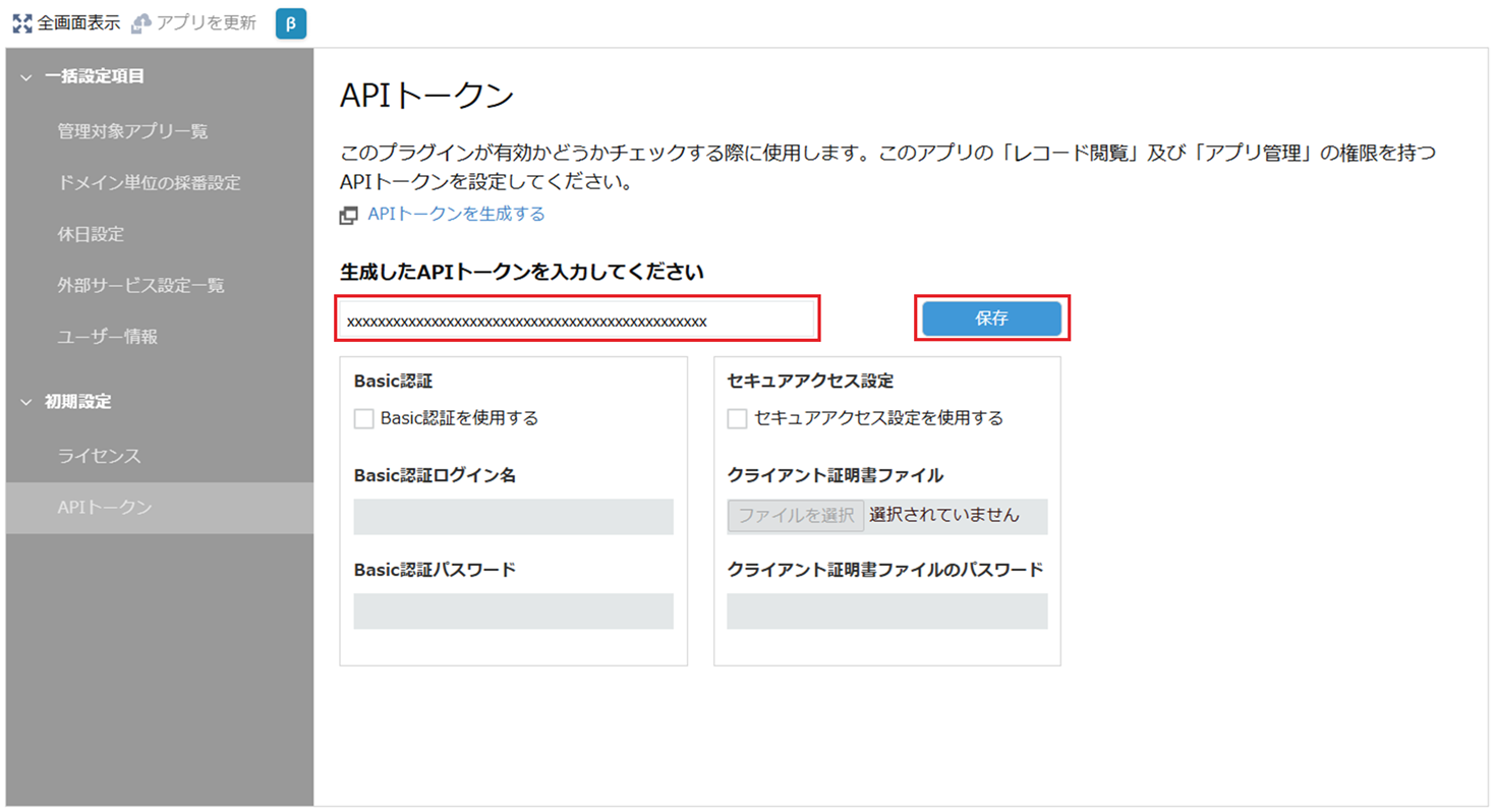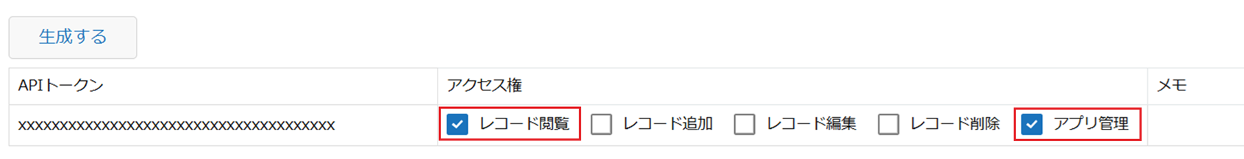 APIトークンの生成手順は、kintoneの標準操作(APIトークンを生成する)を参照してください。