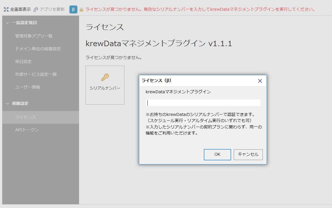 krewDataマネジメントのプラグイン設定画面でライセンス設定を行います。