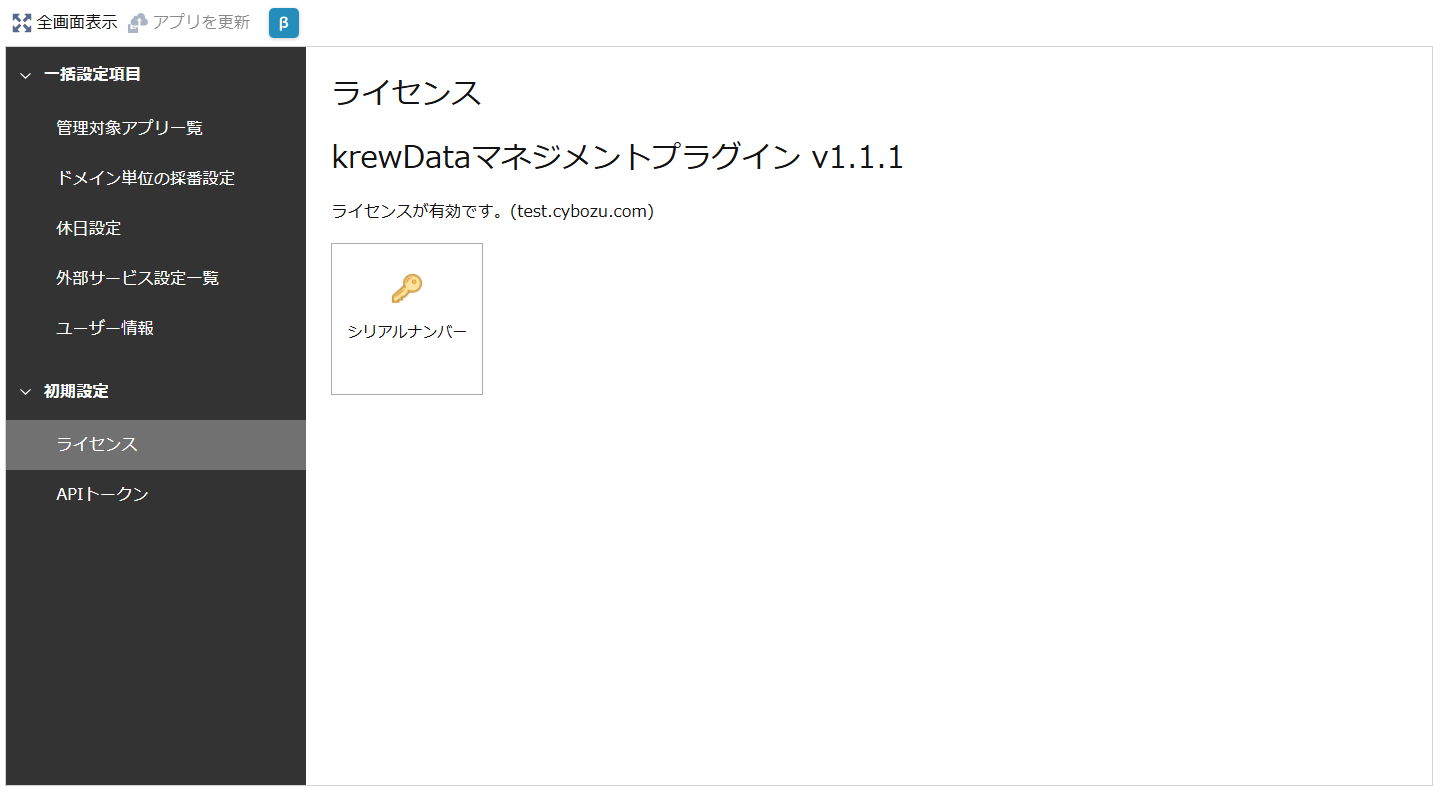 krewDataマネジメントアプリ側で、APIトークンの設定をします。このAPIトークンは、krewData標準アプリがkrewDataマネジメントアプリの存在を確認する際に使用します。