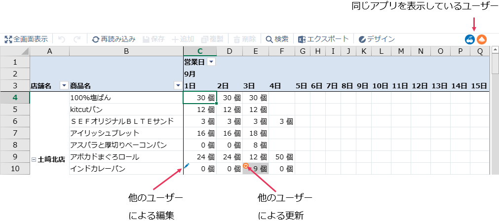 他のユーザーが更新したレコードは読み取り専用になります。他のユーザーが更新したレコード以外は編集することができ、再読み込みをすることで他のユーザーが更新したレコードを編集することができます。 kintoneでは複数のユーザーが同じレコードを同時に更新しようとした場合、最初にレコードを更新したユーザーの操作が優先されます。あとからレコードを更新しようとしたユーザーはエラーメッセージが表示され更新することができません。リアルタイム共同編集機能では、事前に他のユーザーのレコードの更新を知ることができ、同時編集時のエラーを軽減することができます。